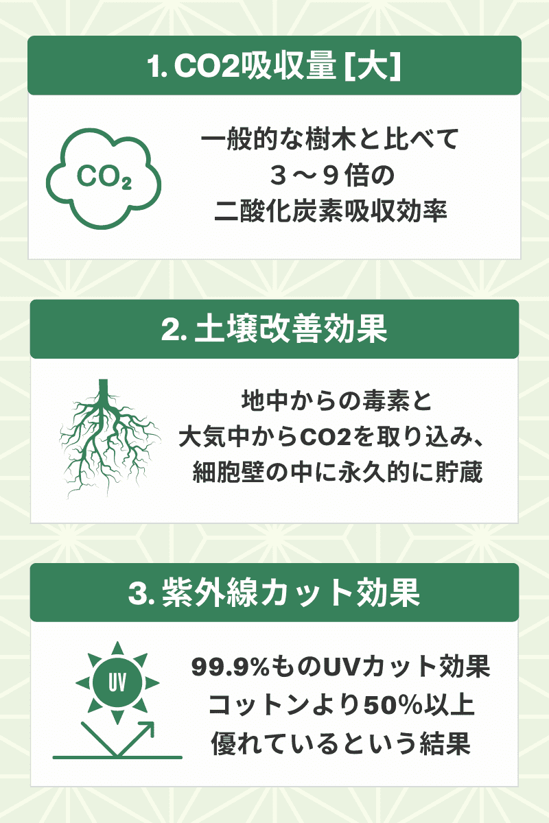 CO2吸収力が高く、わずか90日間で1ヘクタールにつき、21000kgを吸収します。これは小麦の1.6倍、松の8倍にあたります。