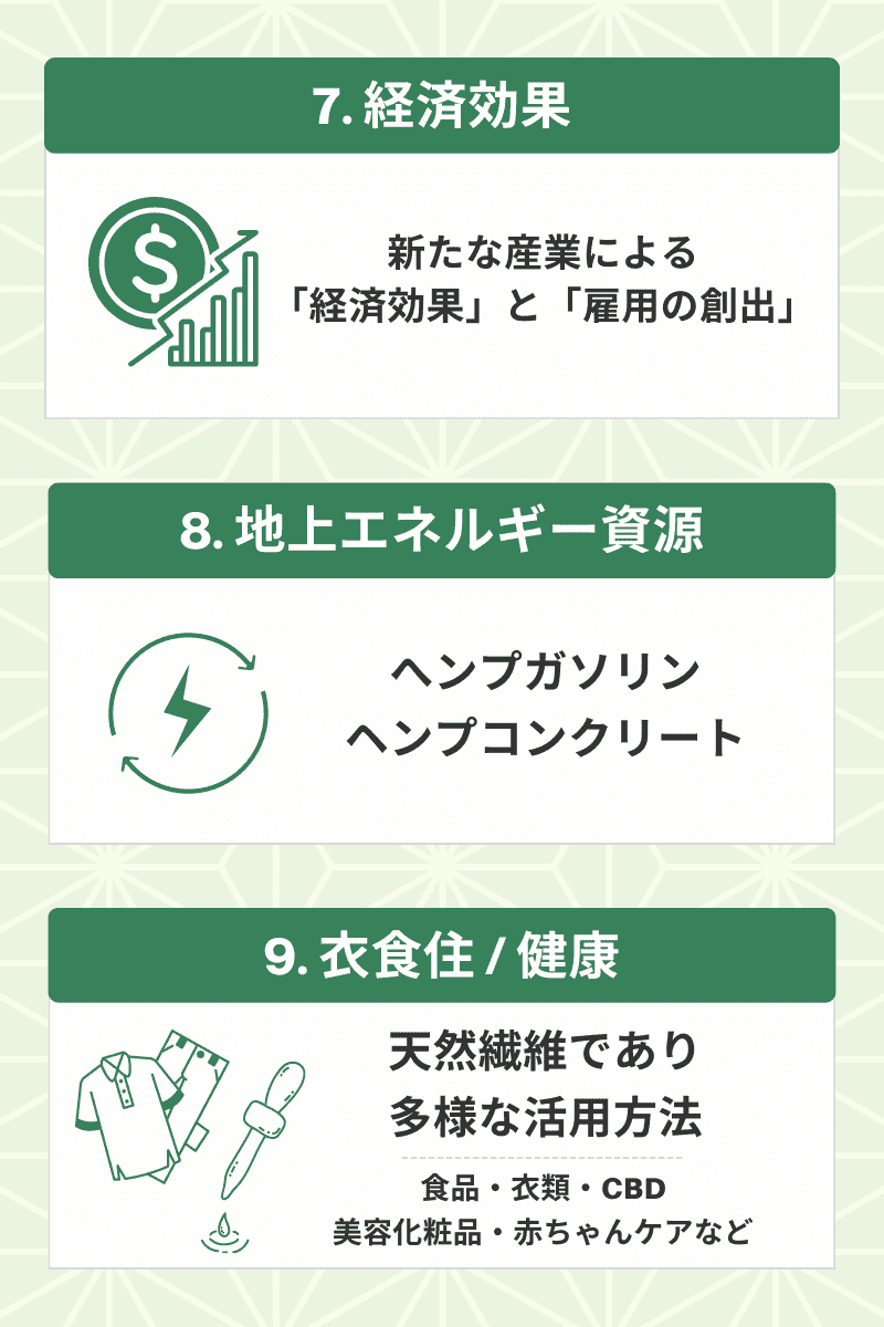 また水の量が少なくても簡単に育つため、ヘンプ栽培に置き換えるだけで水に関する問題解決へ一歩進められる可能性を持つ。