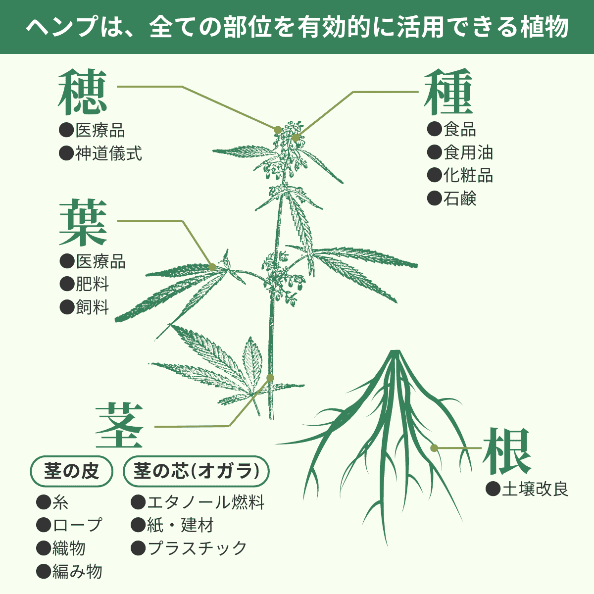 ヘンプは、全ての部位を有効的に活用できる植物で、茎(繊維部分、木質部分)、種、葉、花穂、根といった部位を用いて様々な産業用の用途に活用でき、その数は、3万種をも上回るといわれています。